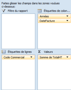 - Choisir les champs appropriés. Pour notre exemple, on retiendra le code commercial en lignes et le mois de facturation en colonnes.