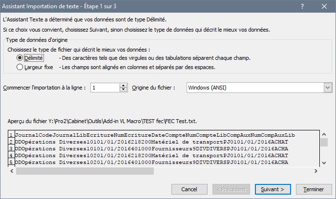 (Si votre FEC est déjà importé dans Excel, il convient alors de se rendre dans le menu Données / Convertir) - Etape 1 : choisir « Délimité »