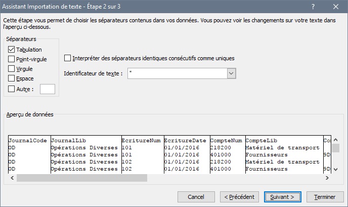 - Etape 2 : choisir séparateur « Tabulation »