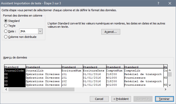 - Etape 3 : pour chacune des colonnes contenant des dates, cliquer sur la colonne concernée puis choisir Format « Date : AMJ ». (Cela aura pour effet de convertir les dates qui sont en format année-mois-jour dans le FEC vers un format compatible avec Excel)
